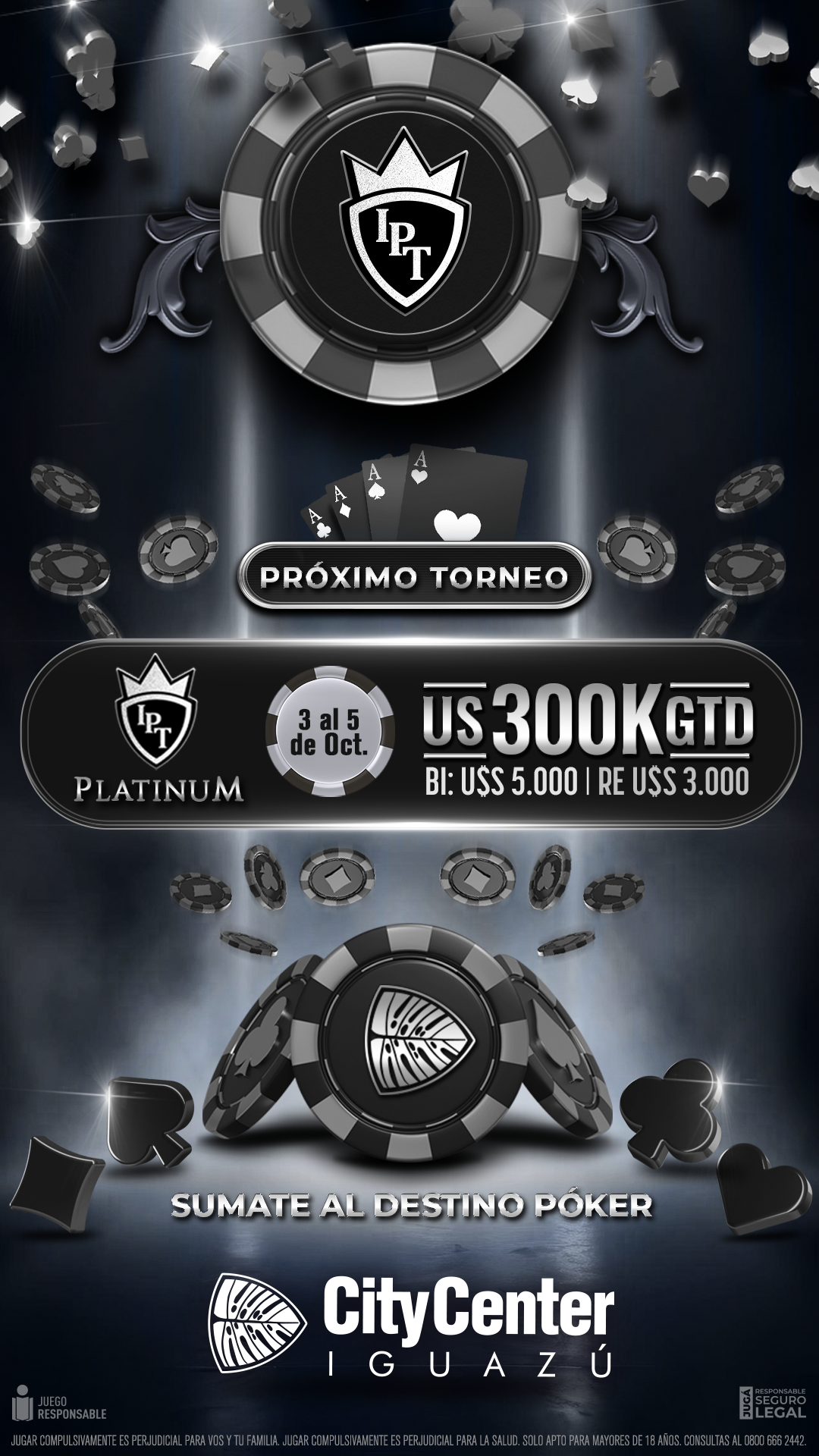 Se trata del IPT pero en versión Platinum, que tendrá lugar del 3 al 5 de octubre. Este nuevo evento pokeríl tendrá un valor de entrada de 5,000 dólares, con reentries 3,000 y un premio garantizado de 300,000 dólares. Impresionante.