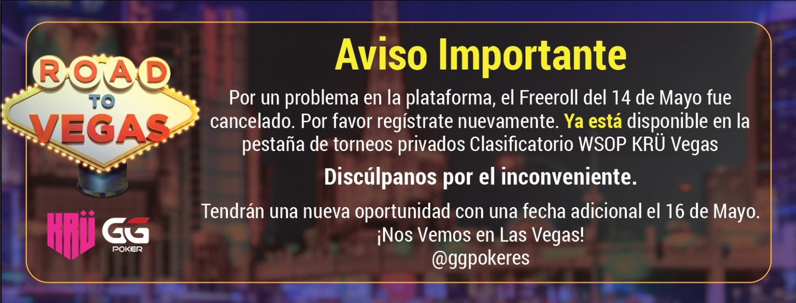 Por un error el la plataforma se canceló el freeroll de mañana de KRÜ, ya se volvió a crear pero los usuarios deben volver a registrarse.