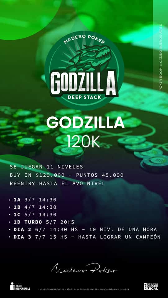 La serie “Godzilla” tendrá este lunes, el desenlace del High Godzilla de 250.000 pesos de inscripción, pero además, tendrá el primer vuelo del Main Event, que tiene un buy in de 120.000 pesos que se cambian por 45.000 puntos de stack inicial.
